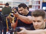 Урок довоенной подготовки в Спортивно-патриотическом клубе "Ярополк". Мужчины во время практического занятия по обращению с автоматом Калашникова.