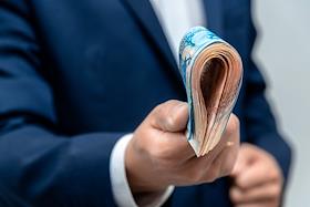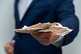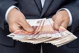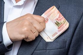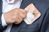 Жанровая фотография. Мужчина кладет пачку рублевых купюры в 5000 рублей в нагрудный карман пиджака.