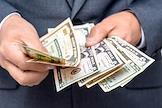 Жанровая фотография. Купюры долларов США достоинством 5 и 20 долларов в руках мужчины.