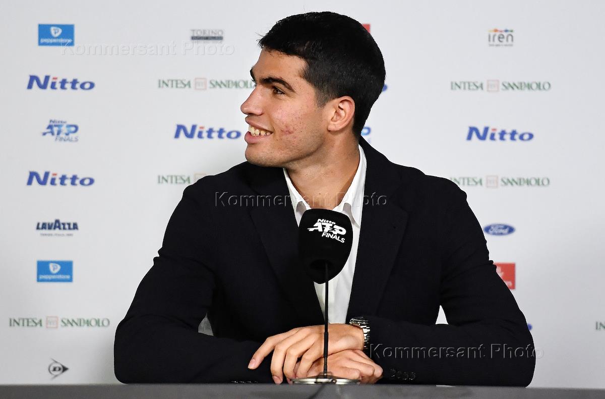 Итоговый турнир ATP (Nitto ATP Finals) в Турине. Испанский теннисист Карлос Алькарас во время пресс-конференции перед церемонией награждения Кубком первой ракетки мира по итогам сезона.