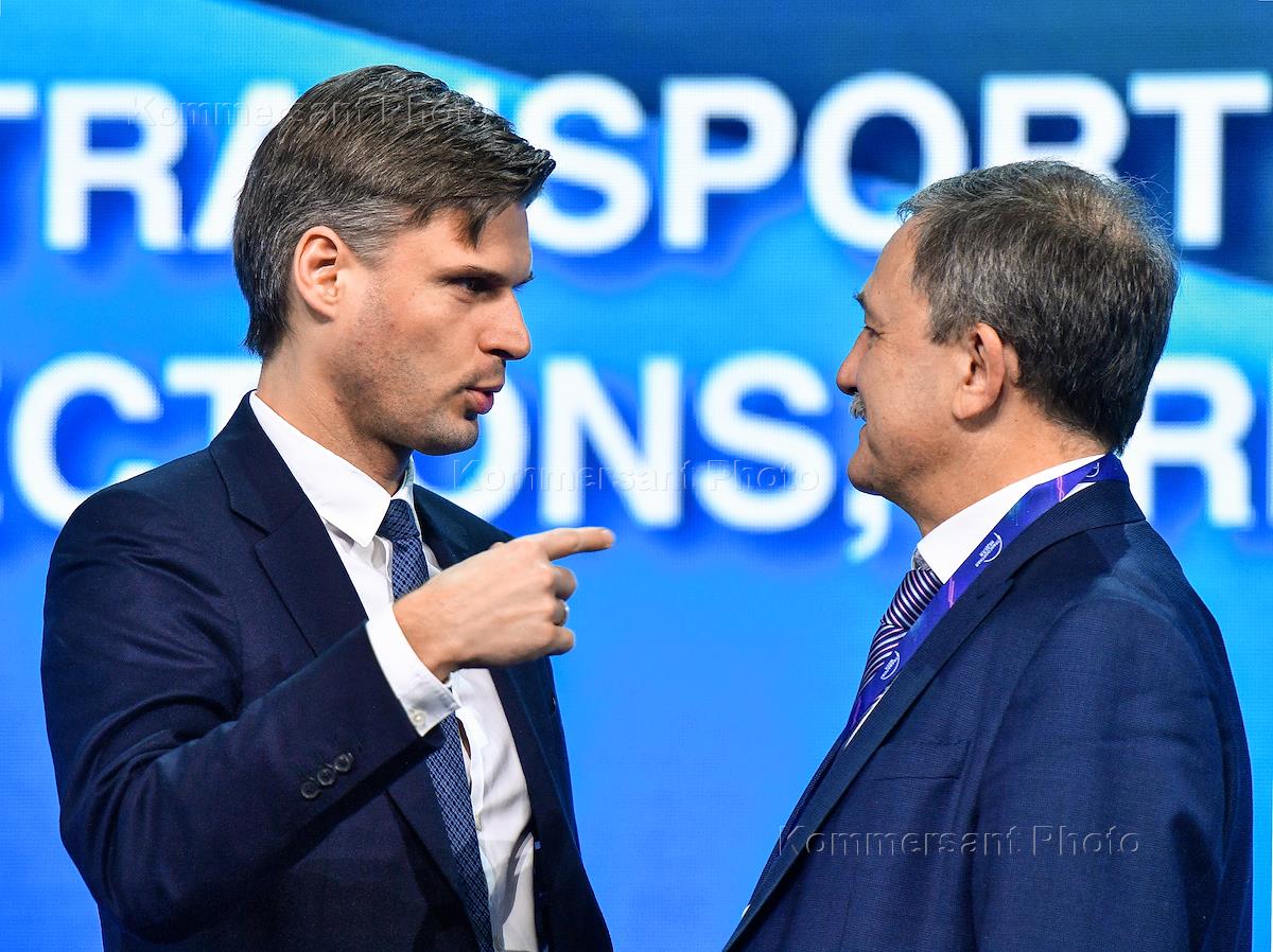 Транспортная неделя 2022 в Гостином дворе. Пленарная дискуссия "Международное транспортное сотрудничество в 2022. Новые направления, тренды, результаты". Первый заместитель руководителя ФТС России, вице-председатель Совета Всемирной таможенной организации Руслан Давыдов (слева) и первый заместитель генерального директора ОАО РЖД Сергей Павлов (в центре) во время дискуссии.
