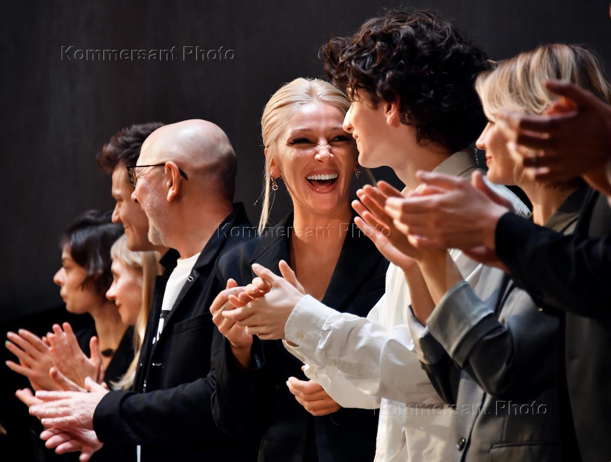 Премьера сериала "Монастырь" в кинотеатре "Художественный". Слева направо: режиссер, актер Филипп Янковский, актеры Анастасия Ивлеева, Наталья Кудряшова и Марк Эйдельштейн на премьере.