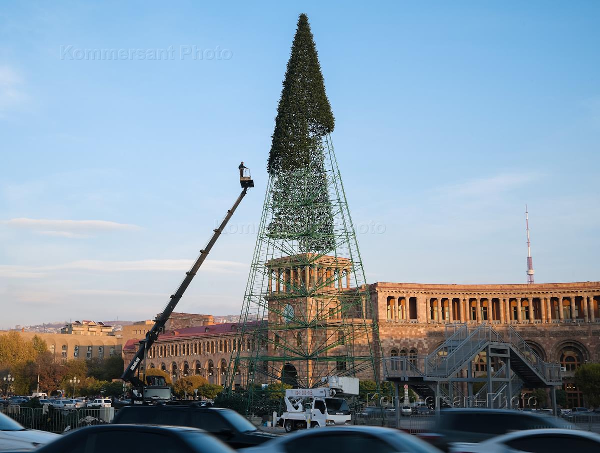 Виды Еревана. Жанровая фотография. Монтаж новогодней ели на площади Республики.