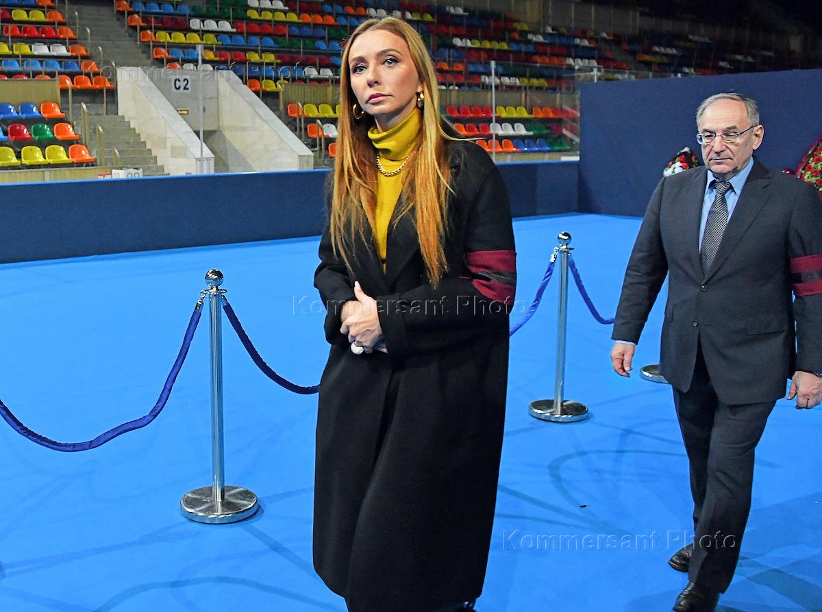 Церемония прощания с президентом Федерации фигурного катания на коньках России (ФФККР) Александром Горшковым на Малой спортивной арене в Лужниках. Олимпийская чемпионка по фигурному катанию Татьяна Навка (слева) и генеральный директор ФФККР Александр Коган (справа) во время церемонии прощания.