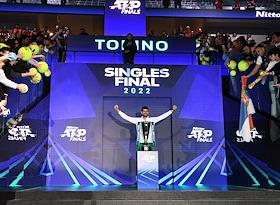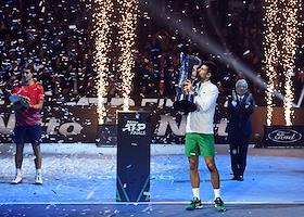 Итоговый турнир ATP (Nitto ATP Finals) в Турине. Финал. Церемония награждения победителя турнира. Сербский теннисист Новак Джокович после матча с норвежским теннисистом Каспером Руудом на церемонии награждения. Новак Джокович стал победителем турнира.