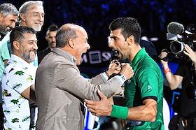 Итоговый турнир ATP (Nitto ATP Finals) в Турине. Финал. Церемония награждения победителя турнира. Сербский теннисист Новак Джокович (справа) и его менеджер Эдоардо Артальди (в центре) на церемонии награждения после матча с норвежским теннисистом Каспером Руудом. Новак Джокович стал победителем турнира.