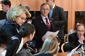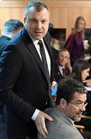 Расширенное заседание комитета Государственной думы (ГД) России по информационной политике, информационным технологиям и связи, посвященное принятому в первом чтении законопроекту о запрете пропаганды нетрадиционных сексуальных отношений и педофилии. Заместитель председателя комитета ГД России по информационной политике, информационным технологиям и связи Евгений Попов (слева) во время заседания.