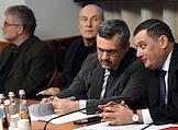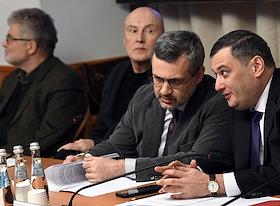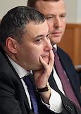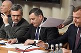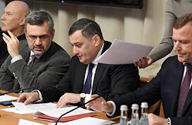 Расширенное заседание комитета Государственной думы (ГД) России по информационной политике, информационным технологиям и связи, посвященное принятому в первом чтении законопроекту о запрете пропаганды нетрадиционных сексуальных отношений и педофилии. Справа налево: заместитель Руководителя Федеральной службы по надзору в сфере связи, информационных технологий и массовых коммуникаций (Роскомнадзор) Вадим Субботин, председатель комитета ГД России по информационной политике, информационным технологиям и связи Александр Хинштейн и председатель синодального Информационного отдела Московского патриархата Владимир Легойда во время заседания.