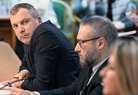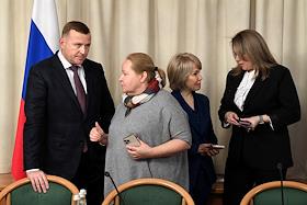 Расширенное заседание комитета Государственной думы (ГД) России по информационной политике, информационным технологиям и связи, посвященное принятому в первом чтении законопроекту о запрете пропаганды нетрадиционных сексуальных отношений и педофилии. Заместитель руководителя Федеральной службы по надзору в сфере связи, информационных технологий и массовых коммуникаций (Роскомнадзор) Вадим Субботин (слева) и заместитель министра культуры России Надежда Преподобная (вторая справа) во время заседания.