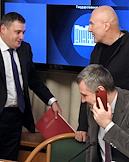 Расширенное заседание комитета Государственной думы (ГД) России по информационной политике, информационным технологиям и связи, посвященное принятому в первом чтении законопроекту о запрете пропаганды нетрадиционных сексуальных отношений и педофилии. Слева направо: председатель комитета ГД России по информационной политике, информационным технологиям и связи Александр Хинштейн, композитор, музыкант Игорь Матвиенко и и председатель синодального Информационного отдела Московского патриархата Владимир Легойда перед началом заседания.