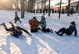 Виды ближайшего к шахте "Листвяжная" поселка городского типа Грамотеино, входящего в состав Беловского городского округа Кемеровской области. Жанровые фотографии. Дети катаются с горки.