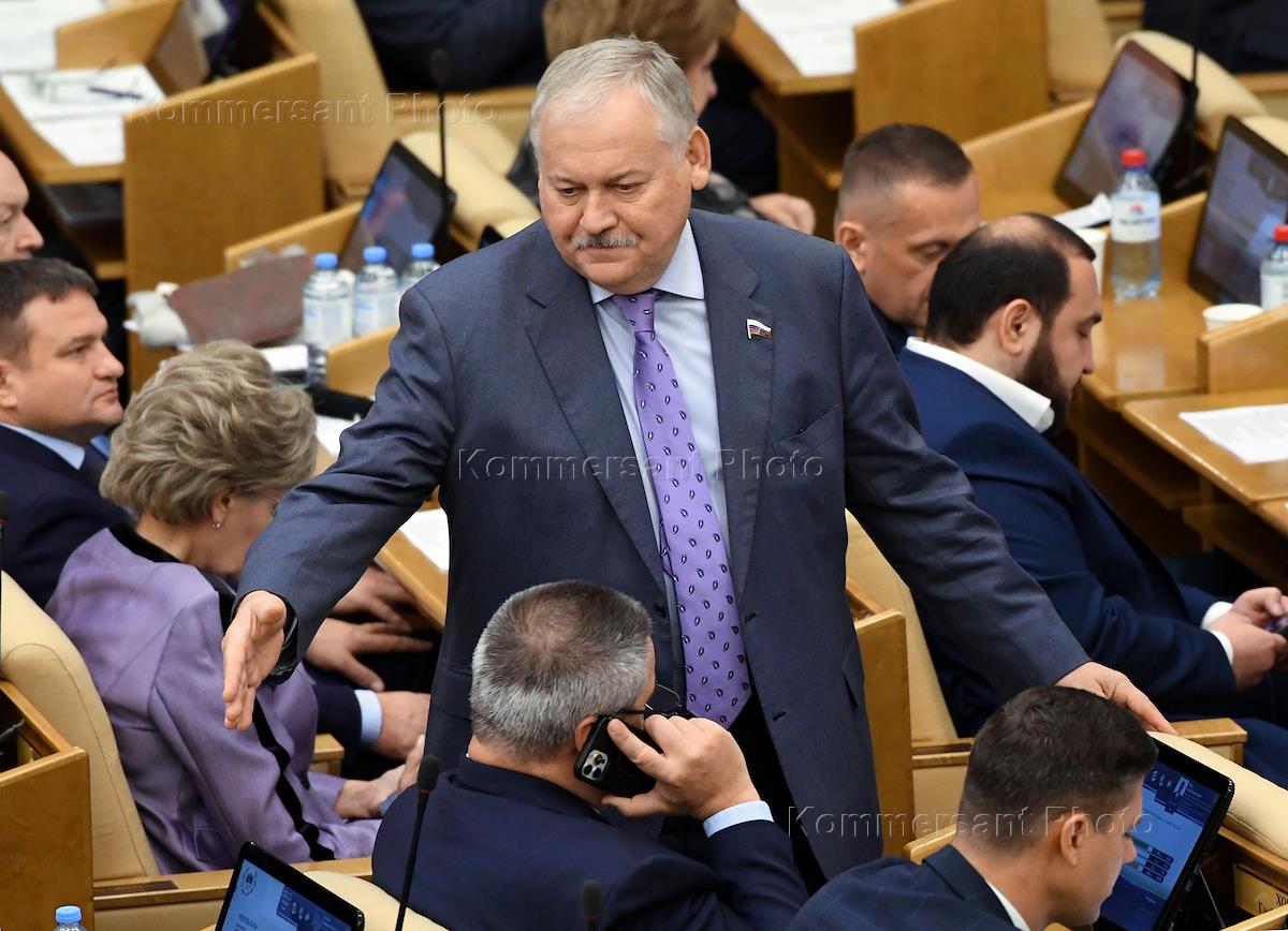 Пленарное заседание Государственной думы (ГД) России. Первый заместитель председателя комитета ГД России по делам Содружества Независимых Государств, евразийской интеграции и связям с соотечественниками Константин Затулин (в центре) во время заседания.