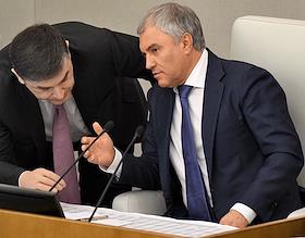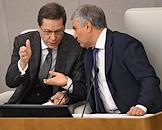 Пленарное заседание Государственной думы (ГД) России. Председатель ГД России Вячеслав Володин (справа) и член комитета ГД России по безопасности и противодействию коррупции Адальби Шхагошев (слева) во время заседания.