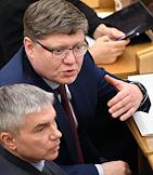 Пленарное заседание Государственной думы (ГД) России. Член комитета ГД России по промышленности и торговле Константин Захаров (слева) и заместитель председателя комитета ГД России по делам национальностей Николай Долуда (справа) во время заседания.