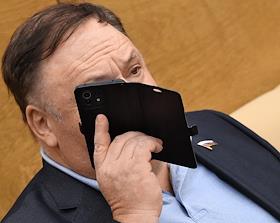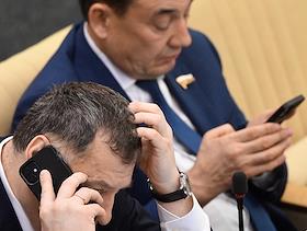 Пленарное заседание Государственной думы (ГД) России. Жанровая фотография. Депутат ГД России с мобильным телефоном в зале заседаний.
