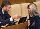 Пленарное заседание Государственной думы (ГД) России. Член комитета ГД России по строительству и жилищно-коммунальному хозяйству Елена Бондаренко (справа) и первый заместитель председателя ГД России по международным делам Шамсаил Саралиев (слева) перед началом заседания.