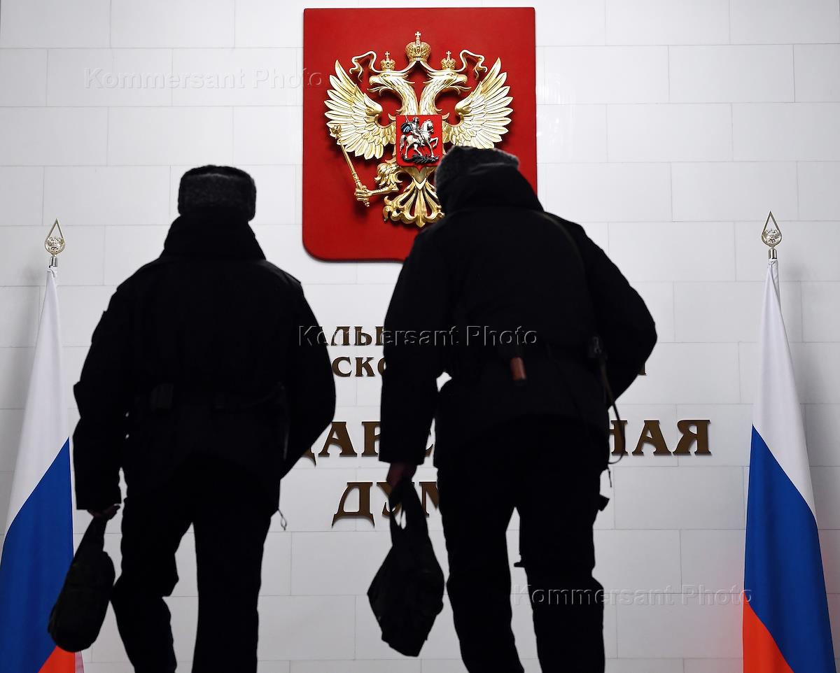 Пленарное заседание Государственной думы (ГД) России. Первый заместитель председателя комитета ГД России по делам Содружества Независимых Государств, евразийской интеграции и связям с соотечественниками Константин Затулин (в центре) во время заседания.