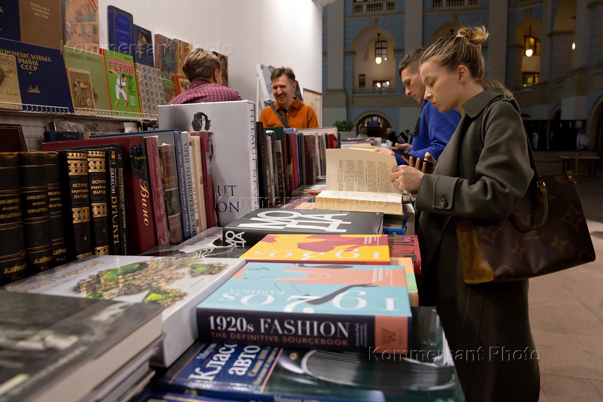48-й Российский Антикварный Салон & Lifestyle "Искусство интерьера" в Гостином дворе. Жанровая фотография. Девушка у стенда со старинными книгами.