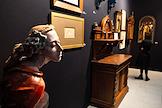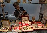 48-й Российский Антикварный Салон & Lifestyle "Искусство интерьера" в Гостином дворе. Жанровая фотография. Женщина рассматривает предметы антиквариата.