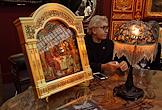 48-й Российский Антикварный Салон & Lifestyle "Искусство интерьера" в Гостином дворе. Жанровая фотография. Участник салона рядом со экспонатом своей экспозиции — иконой, сделанной из янтаря.