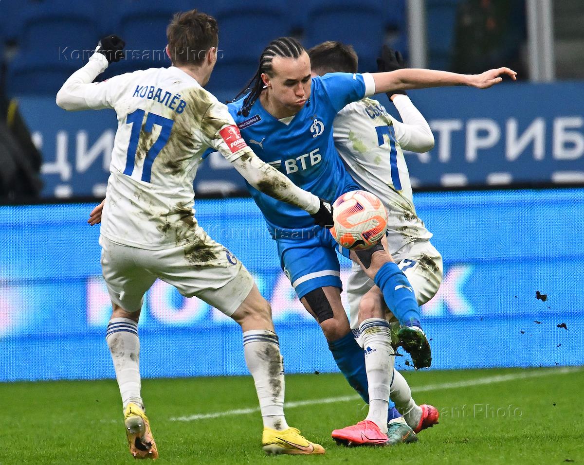 Фонбет - Кубок России по футболу 2022/23. Матч между командами "Динамо" (Москва) – "Оренбург" (Оренбург) на стадионе "ВТБ Арена". Слева направо: игрок команды "Динамо" Диего Лаксальт, игрок команды "Оренбург" Юрий Ковалев и игрок команды "Динамо" Элазар Даса во время матча.