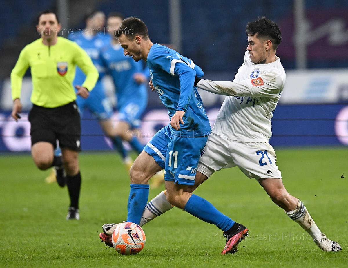 Фонбет - Кубок России по футболу 2022/23. Матч между командами "Динамо" (Москва) – "Оренбург" (Оренбург) на стадионе "ВТБ Арена". Игрок команды "Оренбург" Юрий Ковалев (слева) во время матча.