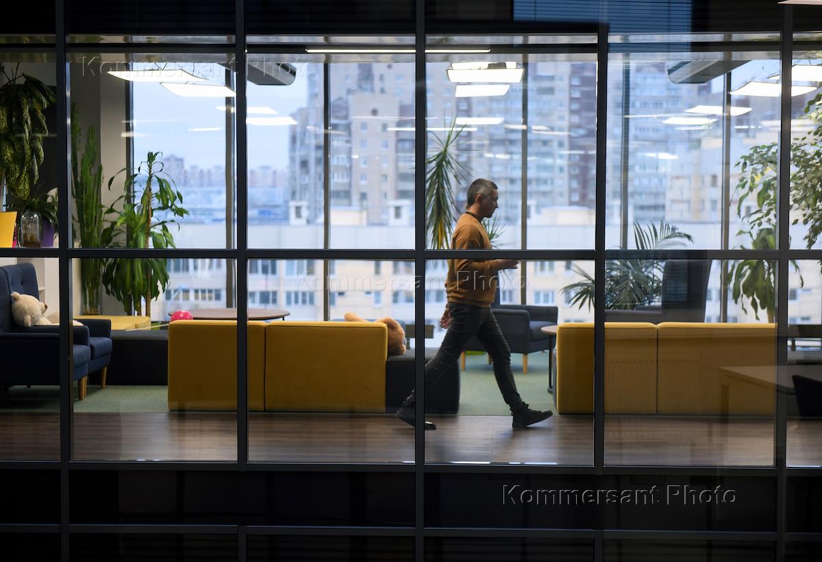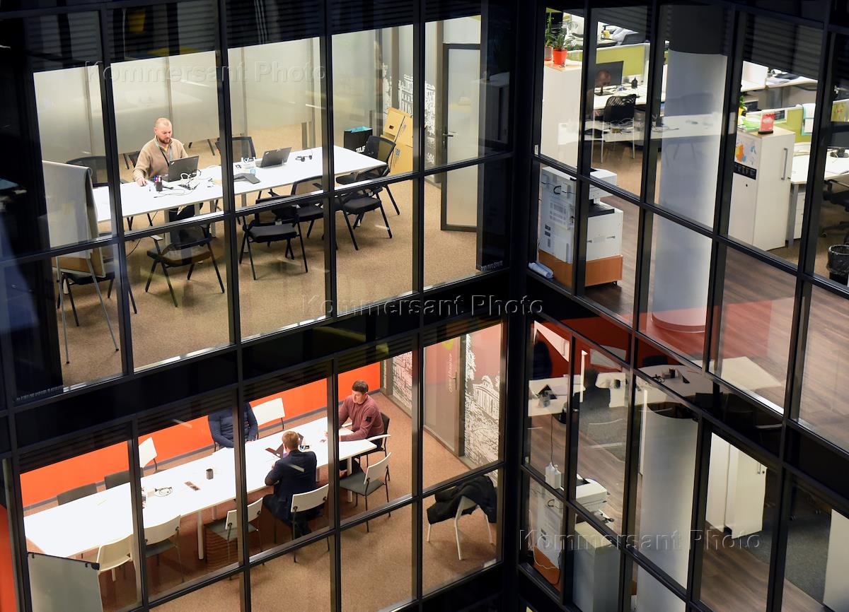 Жанровая фотография. Вид на офисное помещение через стеклянные стены здания.