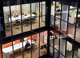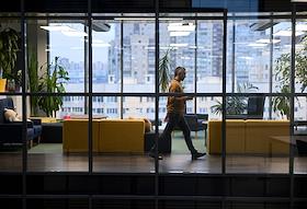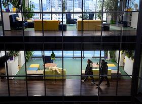 Жанровая фотография. Вид на офисное помещение через стеклянные стены здания.
