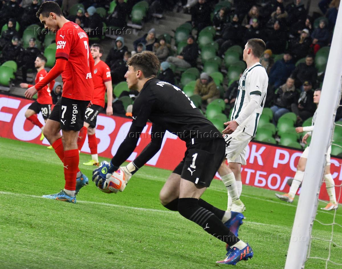 Fonbet - Russian Football Cup 2022/23. Match between the teams "Krasnodar" (Krasnodar) - "Khimki" (Khimki) at the stadium of FC Krasnodar. Khimki team goalkeeper Anton Mitryushkin (center) during the match.
