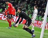 Фонбет - Кубок России по футболу 2022/23. Матч между командами "Краснодар" (Краснодар) - "Химки" (Химки) на стадионе ФК "Краснодар". Вратарь команды "Химки" Антон Митрюшкин (слева) во время матча.