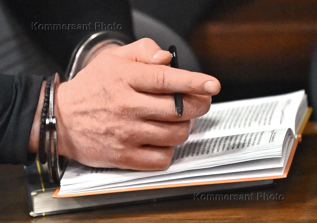 Вынесение приговора по существу дела совладельца группы компаний "Сумма" Зиявудина Магомедова и его брата Магомеда, обвиняемых в создании организованного преступного сообщества (ОПС), в Мещанском районном суде. Жанровая фотография. Руки обвиняемого в наручниках во время заседания суда.