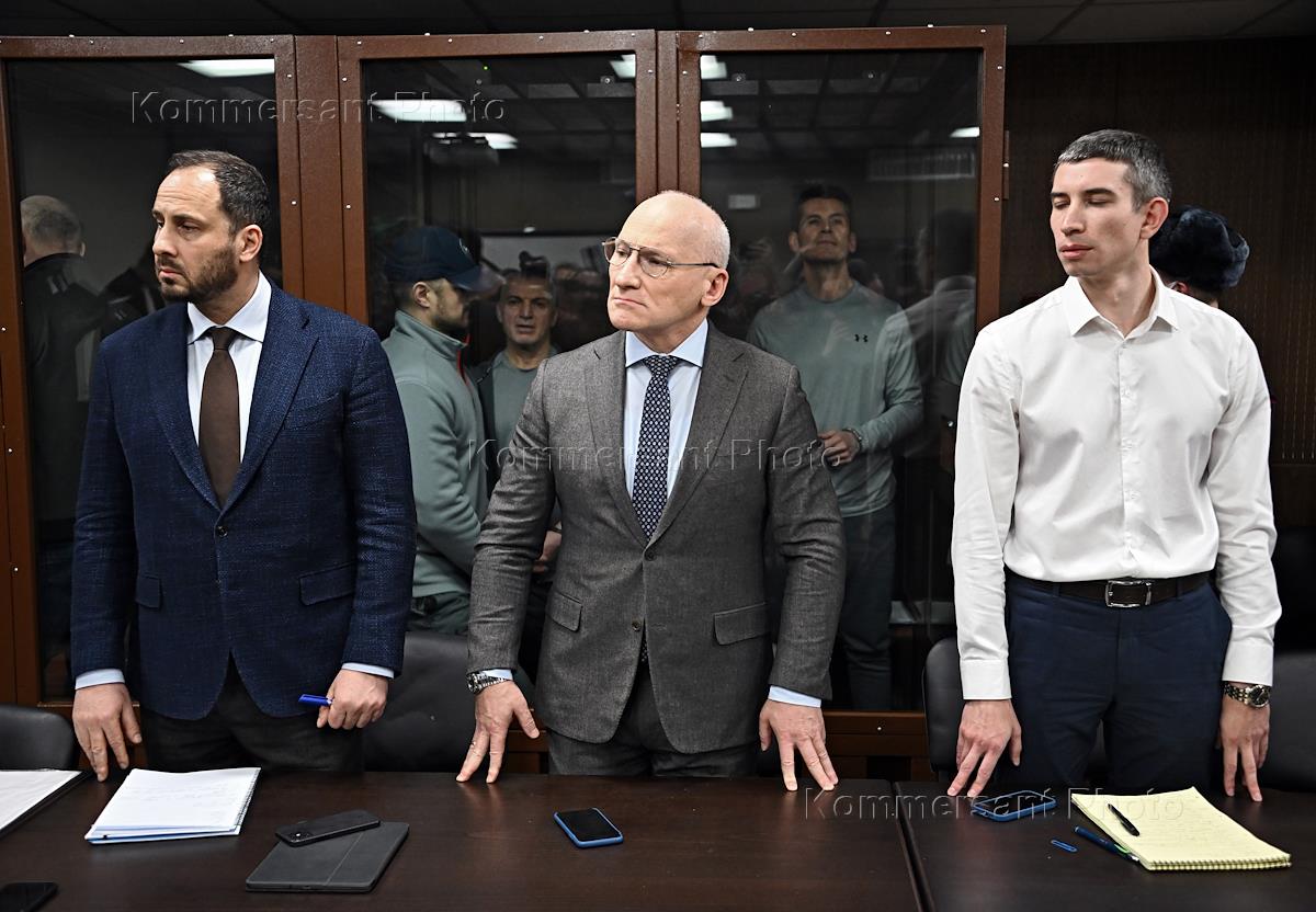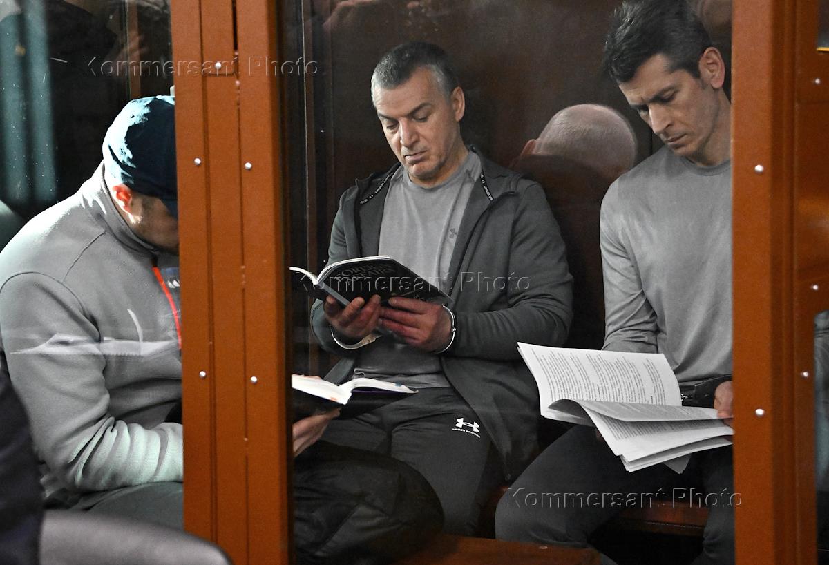 Вынесение приговора по существу дела совладельца группы компаний "Сумма" Зиявудина Магомедова и его брата Магомеда, обвиняемых в создании организованного преступного сообщества (ОПС), в Мещанском районном суде. Слева направо: бывший начальник департамента сопровождения бизнеса АО "Объединенная зерновая компания" (ОЗК) Роман Грибанов, бывший генеральный директор ООО "Интекс" Артур Максидов и совладелец группы компаний "Сумма" Зиявудин Магомедов, обвиняемые в хищении более 11 миллиардов рублей, во время заседания суда.