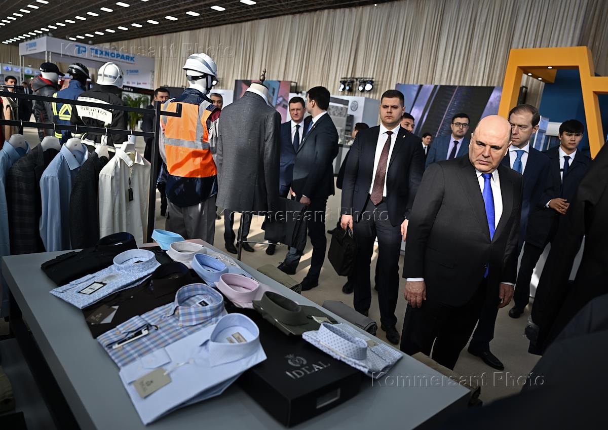 Рабочая поездка предсетателя правительства России Михаила Мишустина в Узбекистан. Председатель Правительства России Михаил Мишустин (третий справа) во время осмотра Национальной отраслевой выставки "Сделано в Узбекистане" в Экспо-центре.