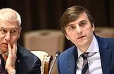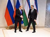 Рабочая поездка председателя правительства России Михаила Мишустина в Узбекистан. Заседание Совместной комиссии на уровне глав правительств России и Республики Узбекистан в широком составе. Министр спорта России Олег Матыцин (слева) и министр просвещения России Сергей Кравцов (справа) перед началом заседания.