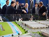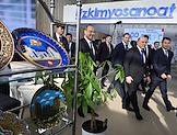 Рабочая поездка предсетателя правительства России Михаила Мишустина в Узбекистан. Председатель Правительства России Михаил Мишустин (третий справа) во время осмотра Национальной отраслевой выставки "Сделано в Узбекистане" в Экспо-центре.