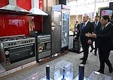 Рабочая поездка предсетателя правительства России Михаила Мишустина в Узбекистан. Председатель Правительства России Михаил Мишустин (второй справа) и заместитель председателя Правительства России - министр промышленности и торговли России Денис Мантуров (третий справа) во время осмотра Национальной отраслевой выставки "Сделано в Узбекистане" в Экспо-центре.