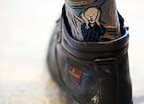Рабочая поездка председателя правительства России Михаила Мишустина в Узбекистан. Жанровая фотография. Мужская нога в ботинке и носке с рисунком на тему картины Эдварда Мунка "Крик".