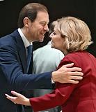 Рабочая поездка председателя правительства России Михаила Мишустина в Узбекистан. Заседание Совместной комиссии на уровне глав правительств России и Республики Узбекистан в широком составе. Заместитель председателя Правительства России - министр промышленности и торговли России Денис Мантуров (слева) и министр культуры России Ольга Любимова перед началом заседания.