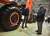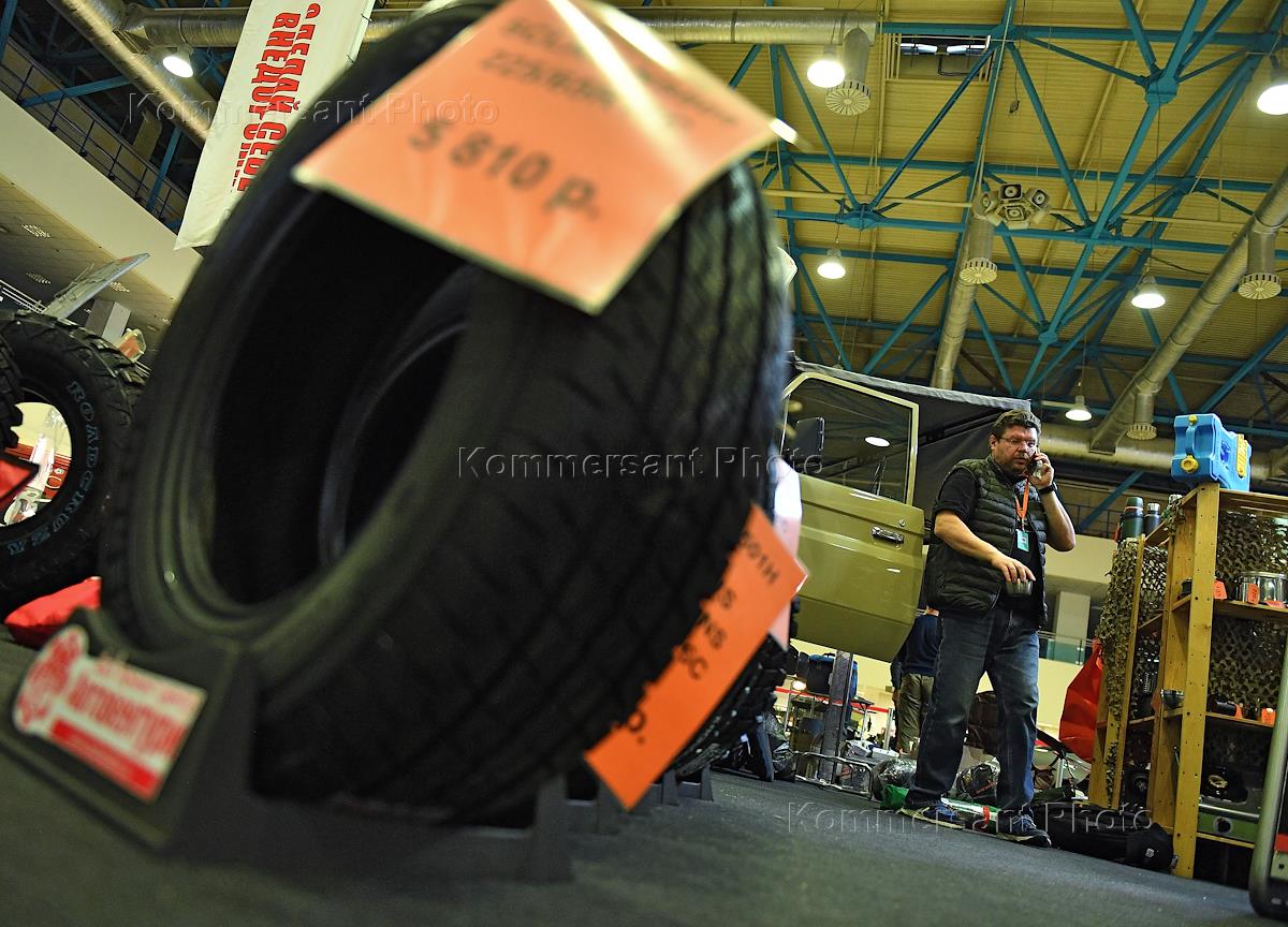Выставка путешествий и техники для активного отдыха "Поехали" в Центральной выставочном комплексе "Экспоцентр". Жанровая фотография. Ценник на автомоибильной шине.