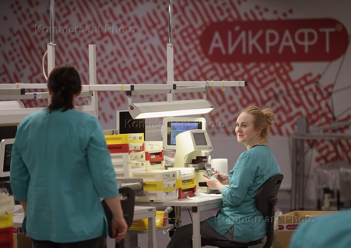 Работа производства компании "Айкрафт Оптика". Жанровая фотография. Линия ОТК - проверка качества очков.