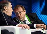 Международный форум "Примаковские чтения – 2022: Трансформация мирового порядка: евразийское измерение" в Конгресс-центре Центра международной торговли (ЦМТ). Помощник президента России, председателя Оргкомитета международного научно-экспертного форума "Примаковские чтения" Юрий Ушаков (слева) и представитель в Совете Федерации России от исполнительного органа государственной власти Чувашской Республики Константин Косачев (справа) во время форума.