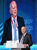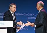 Международный форум "Примаковские чтения – 2022: Трансформация мирового порядка: евразийское измерение" в Конгресс-центре Центра международной торговли (ЦМТ). Президент Национального исследовательского института мировой экономики и международных отношений имени Е.М.Примакова РАН, академик РАН Александр Дынкин (слева) и помощник президента России, председателя Оргкомитета международного научно-экспертного форума "Примаковские чтения" Юрий Ушаков (справа) во время форума.
