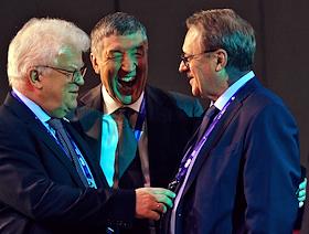Международный форум "Примаковские чтения – 2022: Трансформация мирового порядка: евразийское измерение" в Конгресс-центре Центра международной торговли (ЦМТ). Слева направо: представитель в Совете Федерации России от исполнительного органа государственной власти Республики Карелия Владимир Чижов, председатель Высшего горного совета Юрий Шафранник и заместитель министра иностранных дел России Михаил Богданов во время форума.