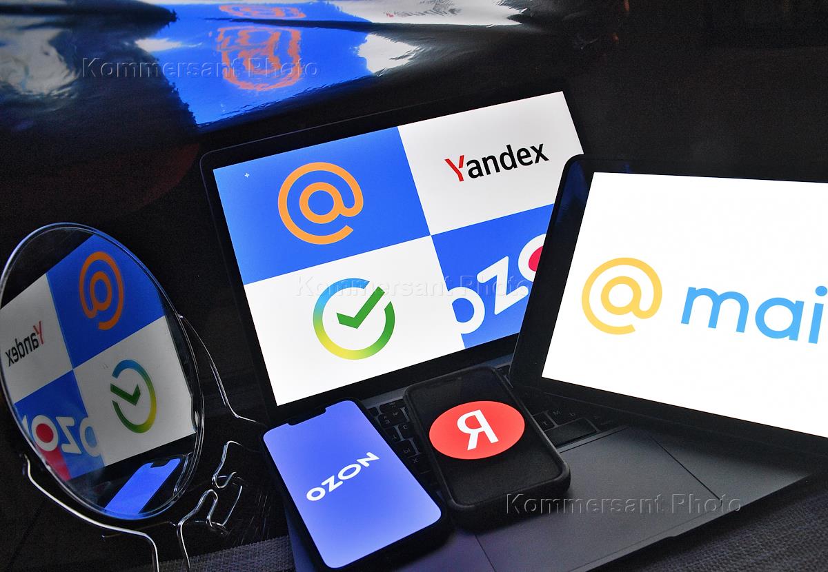 Жанровая фотография. Логотипы Сбера, Яндекса, Озона и Мейл.ру на экранах мобильного телефон, планшета и ноутбука.