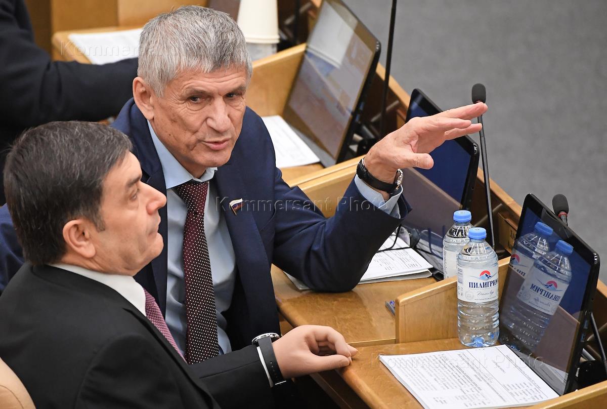 Пленарное заседание Государственной думы (ГД) России. Первый заместитель председателя комитета ГД России по экологии, природным ресурсам и охране окружающей среды Владимир Бурматов (слева) и первый заместитель председателя комитета ГД России по малому и среднему предпринимательству Альфия Когонина (в центре) перед началом заседания.