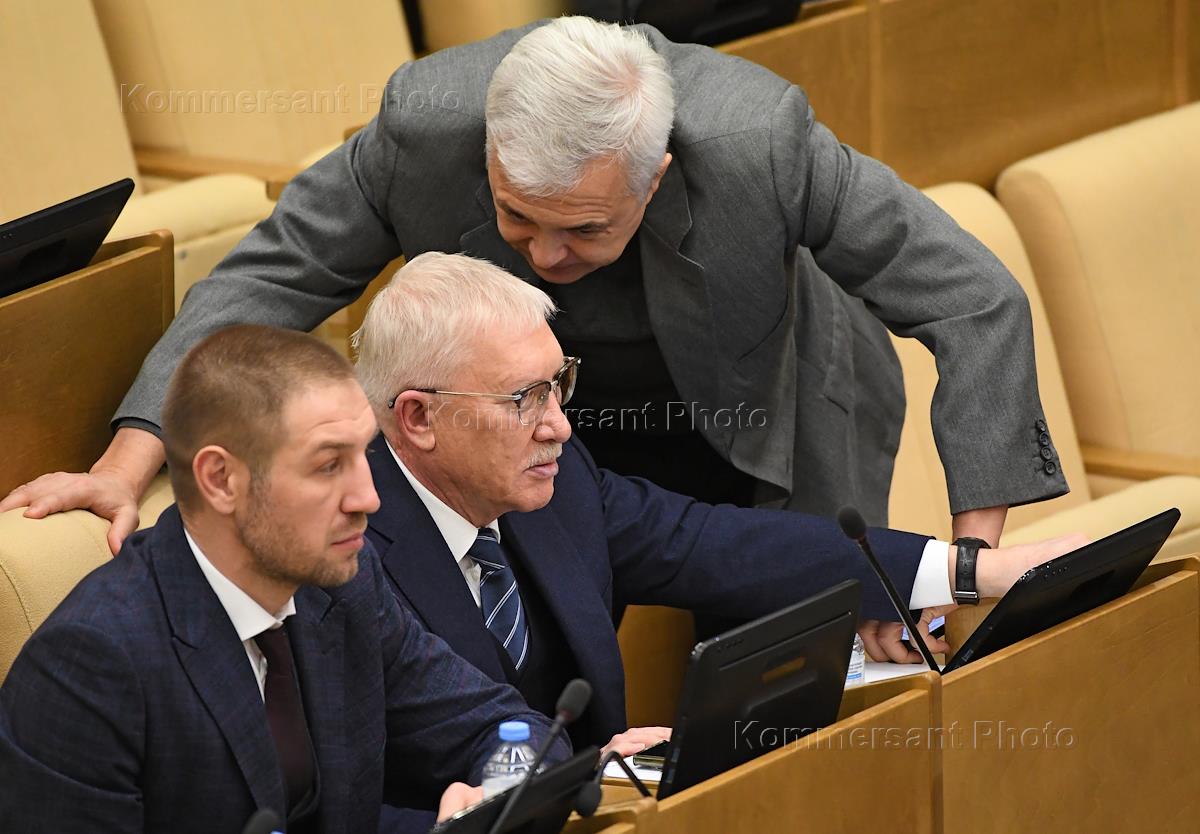 Пленарное заседание Государственной думы (ГД) России. Слева направо: заместитель председателя комитета ГД России по безопасности и противодействию коррупции Анатолий Выборный, первый заместитель председателя комитета ГД России по информационной политике, информационным технологиям и связи Сергей Боярский и председатель комитета ГД России по строительству и жилищно-коммунальному хозяйству Сергей Пахомов перед началом заседания.