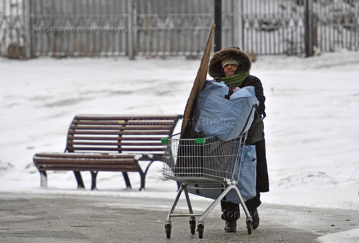 Виды Москвы после снегопада. Жанровая фотография. Женщина везет тележку с вещами.