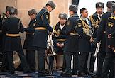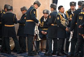Рабочая поездка президента России Владимира Путина в Бишкек. Заседание Высшего Евразийского экономического совета (ВЕЭС) на саммите стран - участниц Евразийского экономического союза (ЕАЭС). Жанровая фотография. Музыканты военного оркестра перед началом заседания.