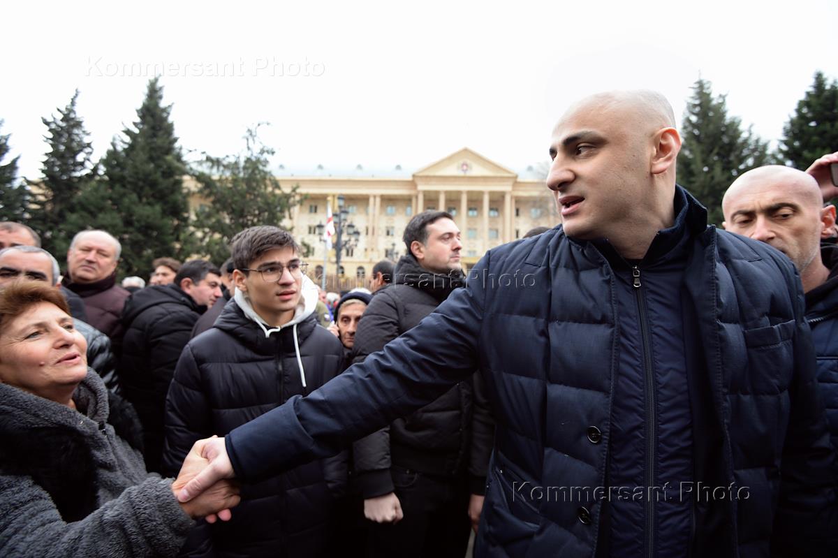 Рассмотрение ходатайства об освобождении или отсрочке наказания бывшему президенту Грузии Михаилу Саакашвили в Тбилисском городском суде. Ситуация у суда. Лидер партии "Единое национальное движение" Никанор (Ника) Мелия (в центре) у здания суда.