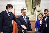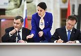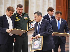 Первый форум "Школа героев", организованный партией "Единая Россия" совместно с Министерством просвещения России в Музее Победы на Поклонной горе. Слева направо: министр просвещения России Сергей Кравцов, помощник президента России Владимир Мединский и председатель комитета Государственной думы России по информационной политике, информационным технологиям и связи Александр Хинштейн на церемонии гашения почтовой марки, посвященной героям России, участникам специальной военной операции, в рамках первого форума "Школа героев".
